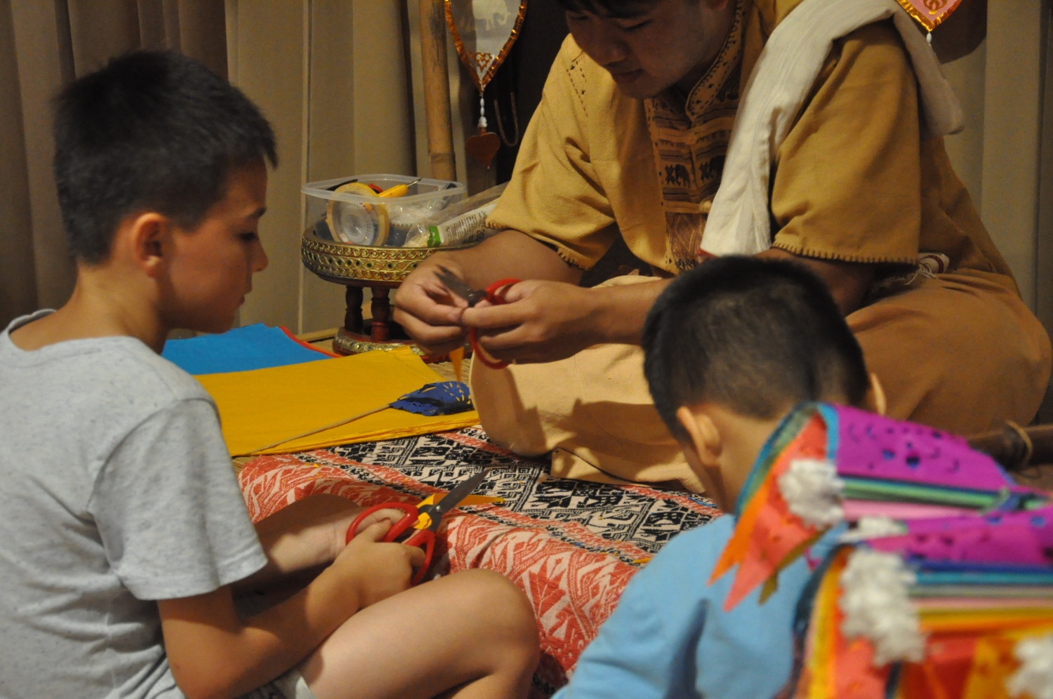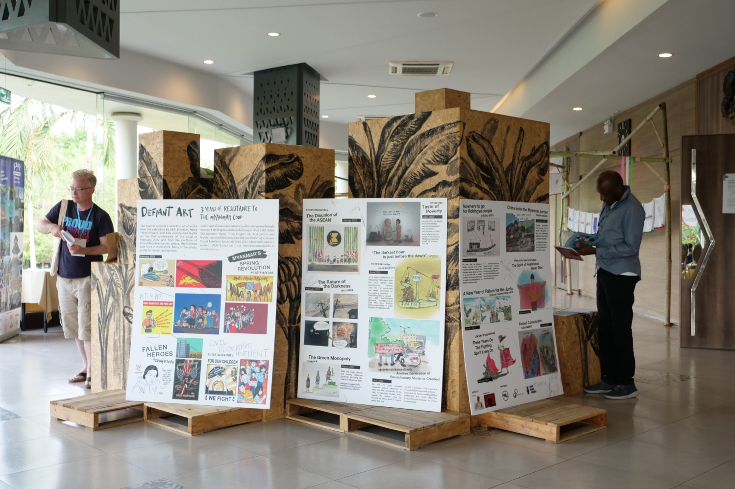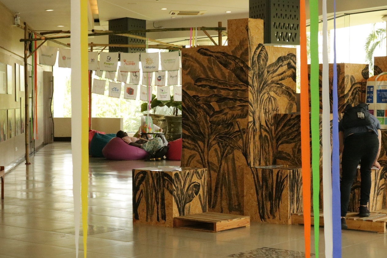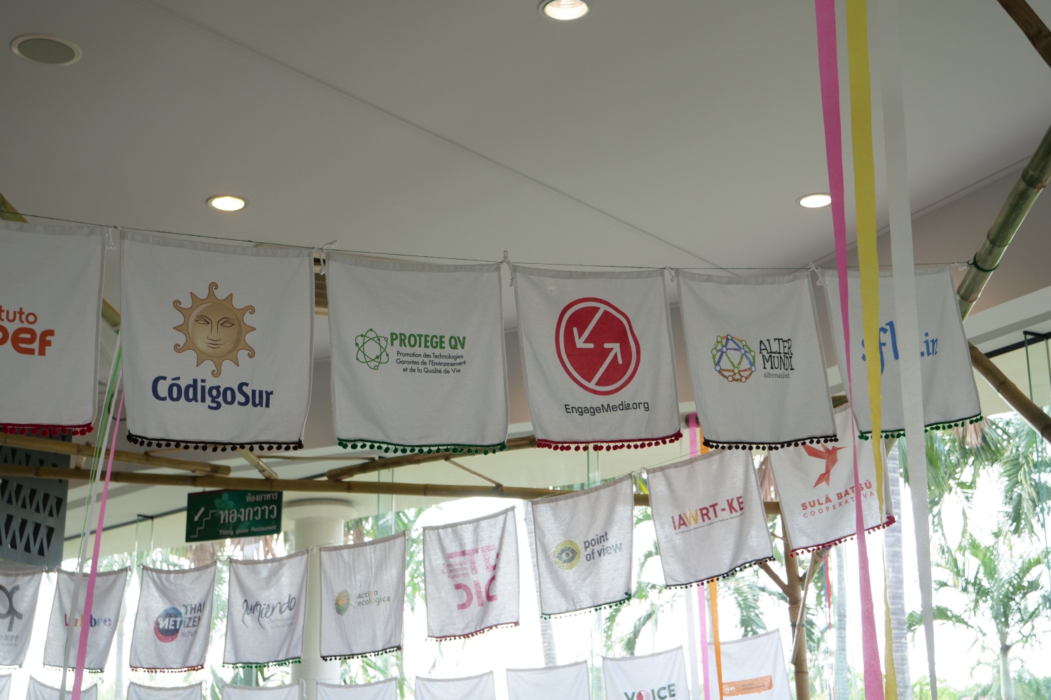 Yhod is a Thai artist who created an installation for the APC Community Gathering of kites hanging atop a bamboo structure on a linoleum floor covering. The internet, he said, is like air: invisible yet necessary for life. The kites are the people navigating through the air to make our lives better. And like a house, the bamboo framework and linoleum flooring make up the structure that supports the community.